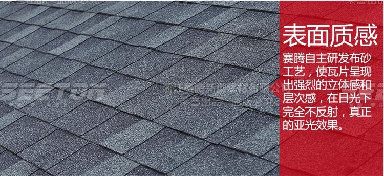 常规单层标准型沥青瓦采用三垂片设计,再配以特有的赛腾跳色技术,大大增强单层瓦的美观程度,层次感立体感将你带入一个全新的视觉盛宴。 使用年限:20年 执行标准:GB/T20747-2015