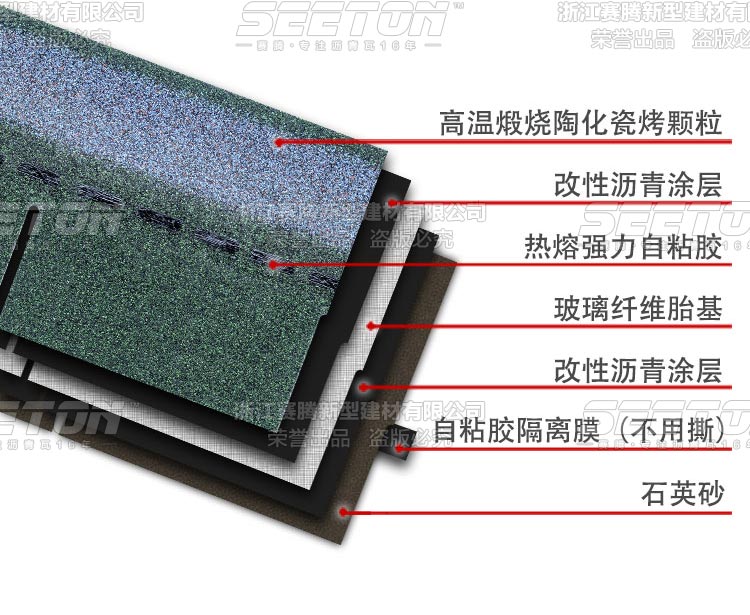 常规单层标准型沥青瓦采用三垂片设计,再配以特有的赛腾跳色技术,大大增强单层瓦的美观程度,层次感立体感将你带入一个全新的视觉盛宴。 使用年限:20年 执行标准:GB/T20747-2015