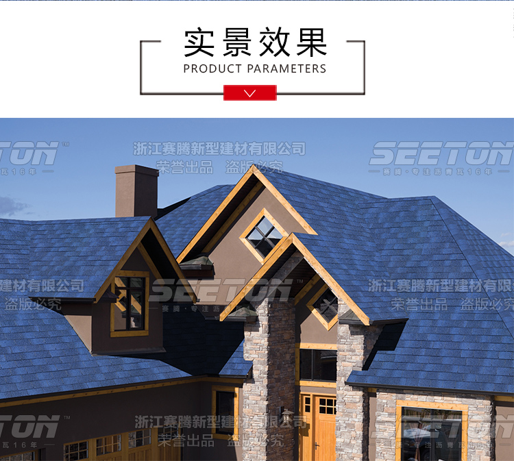 常规单层标准型沥青瓦采用三垂片设计,再配以特有的赛腾跳色技术,大大增强单层瓦的美观程度,层次感立体感将你带入一个全新的视觉盛宴。 使用年限:20年 执行标准:GB/T20747-2015